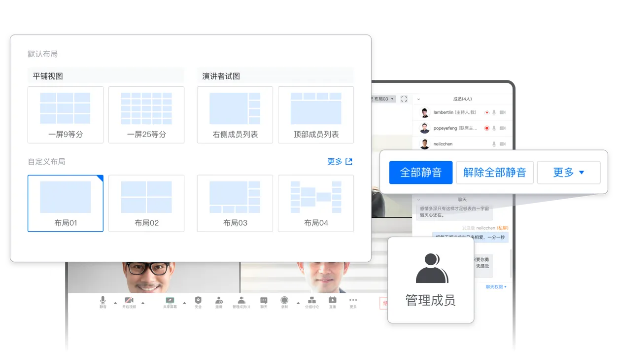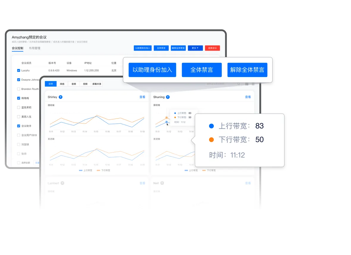 企業管理員在后臺對參會成員進行靜音/移除等會控操作, 確保會議私密性,同時實時跟蹤會議質量,即時響應調整
